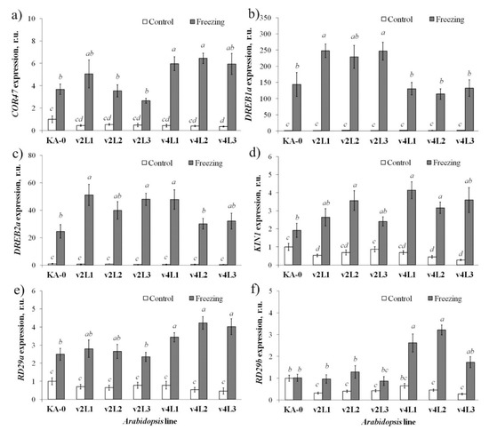 The plants of A. thaliana were subjected to freezing as described [50,52]. Briefly, the sterilized transgenic seeds of Arabidopsis were germinated on plates and the seven-day-old seedlings were transferred to commercially available rich well-watered soil in a controlled environmental chamber at standard conditions. For the low-temperature stress, normally cultured four-week-old A. thaliana plants were stressed in a −10 °C freezer for 45 min and then cultured at +4 °C for 1 h before RNA isolation. Six plants of each line were used in each of ten experiments.