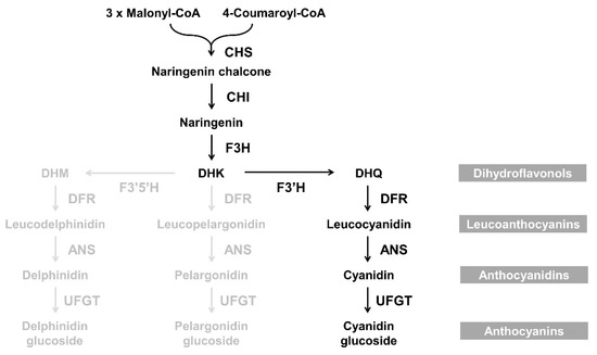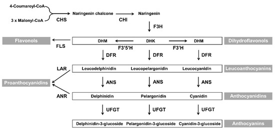 Flower color influences the commercial value of ornamental plants. In general, floral coloration involves the accumulation of pigments such as flavonoids (including anthocyanins), carotenoids, and betalains. The flavonoid class anthocyanins are responsible for flower colors ranging from pale pink to blue in many ornamental plants including chrysanthemum (Chrysanthemum morifolium), carnation (Dianthus caryophyllus), lily (Lilium longiflorum), gerbera (Gerbera hybrida), petunia (Petunia hybrida), and rose (Rosa hybrida). The mechanism of anthocyanin biosynthesis has been extensively investigated, and most structural and regulatory genes involved in this process have been identified in several plant species [1,2,3]. Dihydroflavonol 4-reductase (DFR) plays an important role in the formation of anthocyanins and proanthocyanidins, as shown in the Figure 1. DFR catalyzes the conversion of the colorless dihydroflavonols, including dihydrokaempferol (DHK), dihydroquercetin (DHQ), and dihydromyricetin (DHM), into leucoanthocyanidins. These three colorless dihydroflavonols are substrates of flavonol biosynthesis that are catalyzed by flavonol synthase (FLS). Competition between FLS and DFR can modify the metabolic flux and alter flower color [4,5,6].