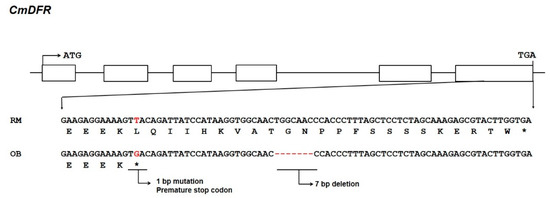 The NCBI database lists four full-length DFR clones from chrysanthemum. All of these genes share at least 95% sequence similarity with the first DFR isolated from chrysanthemum CmDFR (accession ADC96612.1), a 1125 bp sequence with an ORF encoding a deduced protein of 374 amino acids. To investigate the role of DFR in anthocyanin biosynthesis, we isolated DFR sequences from OhBlang (OB) and RedMarble (RM) using primers designed based on the CmDFR sequences. Unexpectedly, the cDNA sequences from OB and RM showed a variation in the C-terminal region as compared with ADC96612.1. Thus, we designated CmDFR from OB as CmDFR-OB, a 1059 bp sequence with an ORF encoding a deduced protein of 352 amino acids (GenBank accession number MT513763). CmDFR from RM (CmDFR-RM) is 1128 bp long, with an ORF encoding a 375 amino acid protein (GenBank accession number MT513764). The high level of amino acid sequence identity among CmDFR, CmDFR-OB, and CmDFR-RM suggests that the genes encoding these proteins are allelic. Multiple sequence alignment of DFRs from chrysanthemum revealed a single nucleotide substitution (T→G) that resulted in a premature stop codon, and also a 7 bp deletion within the sixth exon of CmDFR-OB (Figure 2).