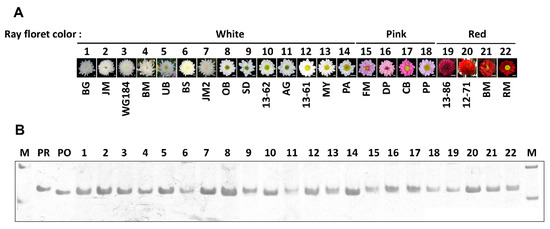 Insertion and deletion (InDel) analysis of the CmDFR gene in chrysanthemum. (A) Photographs of 22 chrysanthemum flowers showing different ray floret colors, scale bar indicates 1 cm; (B) PCR products amplified using InDel-DFR primers and separated on an 6% polyacrylamide gel. M, DNA molecular weight markers. PR and PO used as InDel marker control represent the amplified fragment from the positive plasmids containing CmDFR-RM and CmDFR-RM, respectively.