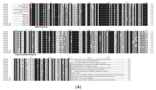 Sequence alignment showed that CmDFRs contain a highly conserved NADP binding region and a substrate binding region at their N-termini, whereas their C-termini are diverse (Figure 4A). These conserved NADP binding domains and substrate binding domains are present in dicot plants such as Arabidopsis, cupflower (Nierembergia spathulata), gentian (Gentiana triflora), gerbera, grape (Vitis vinifera), and petunia, and also in monocot species such as grape hyacinth, rice (Oryza sativa), and maize (Zea mays), suggesting that these proteins are highly conserved among angiosperms.