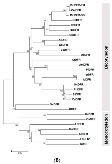 Nucleotide sequence, deduced amino acid sequence, and ORF of CmDFR were determined online (http://www.ncbi.nlm.nih.gov). Structural analysis of the deduced protein was carried out using the ExPASy Molecular Biology Server (http://cn.expasy.org/tools/). Multiple sequence alignments were performed using the CLUSTALW program (https://www.genome.jp/tools-bin/clustalw). A phylogenetic tree was constructed using the neighbor-joining method [25] with MEGA version 6 software.