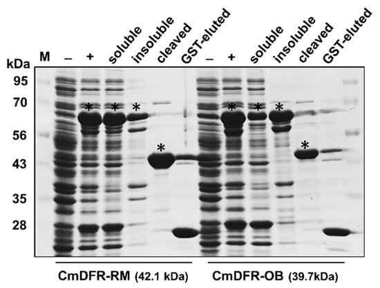 Expression and purification of recombinant CmDFR proteins. The coding regions of CmDFRs from RM and OB without the stop codon were cloned into pGEX-6P-1 in-frame with a glutathione S-transferase (GST) tag and expressed in Escherichia coli BL21 (DE3) cells. Bacterial lysates were prepared for gel loading before (–) and after (+) IPTG induction. The IPTG-induced cells were lysed by sonication and separated into the aqueous fraction (soluble) and non-aqueous pellet (insoluble) by centrifugation. Recombinant proteins in the aqueous fraction were collected using Glutathione Sepharose 4B beads, and their GST tag was removed by PreScission protease (cleaved). The GST moiety that remained on the beads was eluted (GST-eluted). The samples were subjected to SDS-PAGE to confirm the expression and purification of the proteins. Asterisks indicate induced recombinant CmDFR proteins displayed at corresponding size with or without GST moiety.