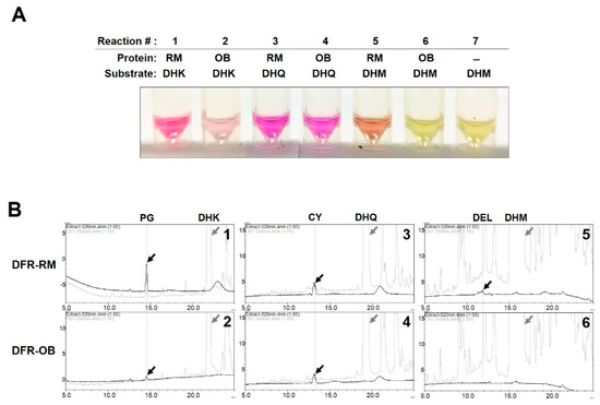 We performed and in vitro enzyme activity assay using dihydroflavonol substrates and equal amounts of the two recombinant CmDFR proteins. Since the products generated from these reactions, leucoanthocyanidins, were unstable, we chemically converted these compounds to stable anthocyanidins with acidic alcohol and identified the corresponding anthocyanidins based on specific color development and HPLC analysis. Both CmDFRs converted DHK to leucopelargonidin, as identified by color development (Figure 6A) and peaks corresponding to pelargonidin in HPLC (Figure 6B). In this reaction, CmDFR-RM exhibited high enzymatic activity, whereas CmDFR-OB showed only slight activity. When DHQ was used as the substrate, both CmDFRs showed comparable levels of activity, although CmDFR-OB activity was somewhat lower than CmDFR-RM. The catalytic activity for the substrate dihydromyricetin (DHM) was detected only in CmDFR-RM. When extracting the reactant with ethyl acetate, the recovery rate of each leucoanthocyanidin product varies depending on their B-ring hydroxylation [7]. Therefore, the difference in substrate preference between each dihydroflavonol substrate could not be determined from the results of this experiment, but these results clearly showed that the catalytic activity of CmDFR-OB was lower than that of CmDFR-RM, and in particular, its activity for DHK substrate was drastically decreased.