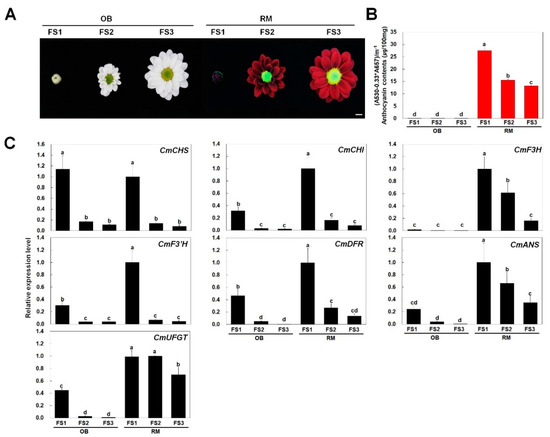 Phenotypes, anthocyanin contents, and anthocyanin biosynthetic gene expression levels in chrysanthemum cultivars OB and RM. (A) Photographs of flowers at different developmental stages (FS1, FS2, and FS3) from the two chrysanthemum cultivars examined in this study; (B) Anthocyanin contents in ray florets of both cultivars; (C) qPCR analysis of anthocyanin biosynthetic genes including four early biosynthetic genes (chalcone synthase (CHS), chalcone isomerase (CHI), flavanone 3-hydroxylase (F3H), and flavonoid 3′-hydroxylase (F3′H)), and three late biosynthetic genes (dihydroflavonol 4-reductase (DFR), anthocyanidin synthase (ANS), and UDP-glucose: flavonoid 3-O-glucosyltransferase (UFGT)). Results represent mean values ± SD from three biological replicates. CmEF1α was used as the reference gene. Different letters above the bars indicate significantly different values (p < 0.05) calculated using one-way ANOVA followed by a Duncan’s multiple range tests.