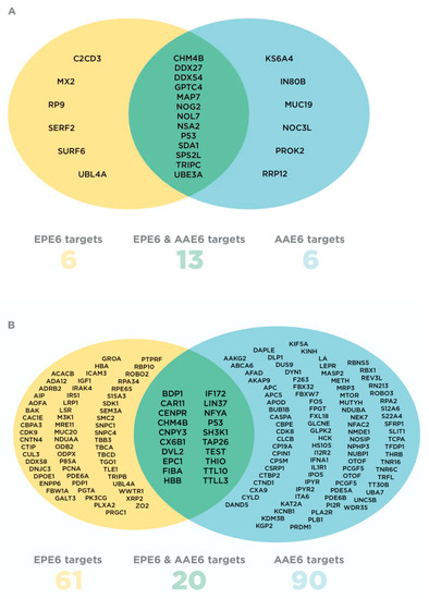 Venn diagrams representing AAE6 and EPE6 host cellular targets for both selection approaches: Peptide Method (A) and Protein-Pathway Method (B). EPE6-specific interactors are in yellow, AAE6-specific interactors are in blue and proteins common to both variants are in green. Protein names are abbreviated based on UniProt protein rather than gene nomenclature, enabling easy identification for searches and further information.