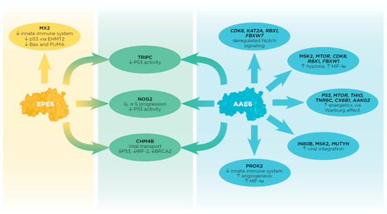 Summary of individual and tandem effects between AAE6 and EPE6 PPIs with host cellular proteins by which E6 may promote cell-transforming processes. Candidates from both approaches are shown for AAE6 only due to the lack of significant FDR values for EPE6 and AAE6/EPE6 combined using the Protein-Pathway Method (upright font = Peptide Method, italic font = Protein-Pathway Method). Candidates from the Peptide Method are shown for AAE6, EPE6, and AAE6/EPE6 (upright font). The first-described E6 binder (P53; Table S1) is most likely targeted through several mechanisms shared by both E6 variants (middle, in green). AAE6 and EPE6 proteins equally bound 3 proteins known to affect P53 inactivation: TRIPC, CHM4B, and NOG2. Collectively, these interactions could result in decreased P53 function far beyond its well-described E6- and E6AP-mediated degradation through the proteasome. Potential interactions unique to AAE6 (right, in blue) are mostly associated with Notch signaling, hypoxia, energetics, DNA base excision repair, and to some extent with the innate immune system. Notably, some AAE6-targeted molecules have multiple roles, e.g., MTOR is associated with hypoxia and metabolism, CDK8 with hypoxia and Notch signaling, and MSK2 with hypoxia and chromatin remodeling, further underlining this variant’s “lead” in the malignant process. AAE6′s association with MUTYH, IN80B, and MSK2 could promote its integration potential and the binding to PROK2 could promote both angiogenesis and hypoxia within infected cells. Being a chemokine-like molecule, PROK2 is implicated in the innate immune system normally attracting macrophages to the site of inflammation. In the hypoxic and consequently more acidic tumour environment, tumour-associated macrophages (TAMs) may develop from original site-filtrating macrophages adapting to the tumour microenvironment. Tumour growth is then promoted by the positive feedback loop between TAMs and epithelial cells via the expression of colony-stimulating factor and epithelial growth factor, respectively. EPE6′s binding to MX2 (left, in yellow) may limit this variant’s ability to integrate into the host genome effectively while it may be more successful in deregulating the host’s viral defence. MX2 also affects the P53 pathway, e.g., via EHMT2 and the expression of pro-apoptotic genes Bax and PUMA, further duplicating well-established anti-P53 E6 activities.