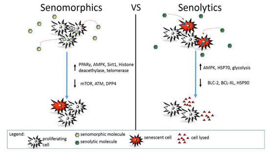 Action mechanism of senomorphic vs. senolytic compounds. Different molecular pathways are modulated by senomorphic or senolytic drugs. In general, senomorphic molecules delay or prevent senescence without affecting the total number of senescent or senescence-prone cells. On the contrary, senolytics induce death in senescent cells reducing their total number in the body or a specific organ.