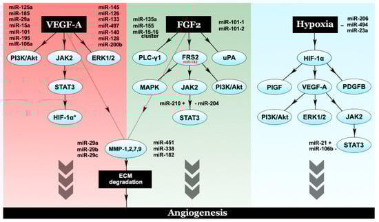 The interplay between different proangiogenic factors and their corresponding modulatory microRNAs. VEGF-A, the chief proangiogenic entity, activates PI3K/Akt, ERK1/2 and JAK2/STAT3. Phosphorylated STAT3 leads to HIF-1α activation, which further increases VEGF-A levels through an autocrine loop. FGF2 activates PLC-γ1, uPA and FRS2. Downstream effectors of FRS2 include the MAPK pathway PI3K/Akt and STAT3. Both VEGF-A and FGF2 are capable of activating a number of MMPs, such as MMP-1,2,7,9, which degrade the ECM and promote angiogenesis. Another major player in angiogenesis is considered to be hypoxia, which exerts its molecular effects through HIF-1α, the hypoxic master regulator. HIF-1α promotes the expression of a number of proangiogenic factors—PlGF, PDGFB and VEGF-A.