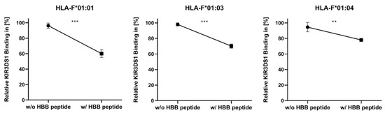 KIR3DS1 binding was reduced in all three allelic variants following peptide loading. By comparing the three allelic variants, the binding of KIR3DS1 illustrated variability depending on the HLA-F allelic variant. Among HLA-F allelic variants, the KIR3DS1/HLA-F*01:01 engagement showed the strongest decrease following the presentation of an HBB peptide, with 36.22%. In K562/F*01:03, the binding affinity of KIR3DS1 decreased by 27.89% following peptide binding. The least change when using the HBB peptide-loading assay was detected in K562/F*01:04 cells, with 16.47%.