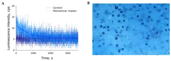 The effect of mechanical stress on the intrinsic luminescence of water was studied (Figure 1). The background luminescence of control water was shown to be around 5 cps. On the whole, the luminescence intensity of intact water was not significantly changed for at least 1 h. Mechanical treatment of water (30 Hz, amplitude of 5 mm, for 5 min) at the beginning of the measurement led to a twofold increase in luminescence intensity compared to the control. The luminescence of mechanically treated water attenuated exponentially with time and equated with the luminescence of control samples after 30–40 min. Interestingly, the phenomenon of increasing intensity of water luminescence was only observed for gas-saturated water, whereas no such increases were observed for the luminescence of freshly distilled water. Thus, it was shown that water saturated with atmospheric gases begins to luminesce under intense mechanical stress.