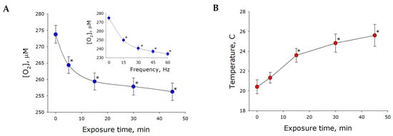 The effect of mechanical stress (30 Hz, amplitude of 5 mm) on molecular oxygen concentration in water (A) and water temperature (B). The insert to figure (A) displays the effect of frequency of mechanical stress on the test parameter (exposure time 5 min). The data are presented as the mean and standard error of the mean for six independent assays. Data differ significantly from control values (0 min) at p < 0.05 (*).