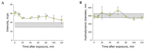 The effect of mechanical stress (30 Hz, 5 mm amplitude) on light scattering intensity (A) and hydrodynamic diameter (B) of nanosized gas bubbles. The shaded area represents the parameters of the control (gas-saturated water before mechanical treatment). The data are presented as the mean and standard error of the mean for six independent assays. Data differ significantly from control values at p < 0.05 (*).