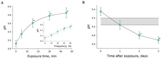 The effect of mechanical stress (30 Hz, 5 mm amplitude) on water pH. (A) The effect of exposure time on pH. The insert displays the effect of frequency of mechanical stress on the test parameter (amplitude of 5 mm, exposure time of 5 min). The measurements were made immediately after stress exposure. (B) Changes of pH observed for several days post-exposure. The shaded area represents the parameters of water before mechanical treatment (control). The data are presented as the mean and standard error of the mean for six independent experiments. Data differ significantly from control values at p < 0.05 (*).