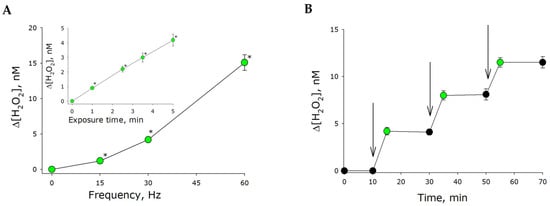 The effect of mechanical stress on hydrogen peroxide concentration in water. (A) The effect of frequency of mechanical stress on hydrogen peroxide concentration (amplitude of 5 mm, exposure time of 5 min). The insert displays the effect of exposure time on hydrogen peroxide concentration (30 Hz, amplitude of 5 mm). (B) Changes in hydrogen peroxide concentration following multiple mechanical stresses. The time of a single exposure was 5 min, with the frequency and amplitude of 30 Hz and 5 mm, respectively. The intervals during which mechanical stress was applied are indicated with vertical errors. The data are presented as the mean and standard error of the mean for six independent assays. Data differ significantly from control values at p < 0.05 (*).