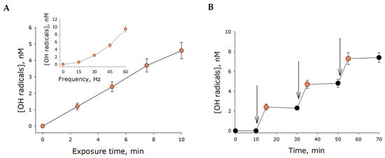 Hydroxyl radical generation in water under mechanical stress (30 Hz, amplitude of 5 mm). (A) The effect of exposure time on hydroxyl radical concentration. The insert displays the effect of frequency of mechanical stress on hydroxyl radical concentration (amplitude of 5 mm, exposure time of 5 min). (B) Changes in hydrogen peroxide concentration following multiple mechanical stresses. The time of a single exposure was 5 min, with the frequency and amplitude of 30 Hz and 5 mm, respectively. The intervals during which mechanical stress was applied are indicated with vertical errors. The data are presented as the mean and standard error of the mean for six independent assays.