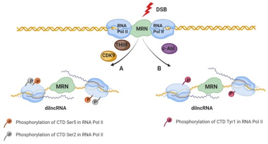 It is widely known that DDR induces signaling pathways that remodel chromatin in the proximity of DSBs [48,49] causing an inhibitory effect on transcription at nearby promoters in order to avoid collisions or interference of the transcriptional and repair machinery [50,51,52,53,54]. The DSBs’ inhibitory effect of transcription by RNA polymerase II (RNA Pol II) depends on the ATM and/or DNA-PKcs, the chromatin remodeler BRG1, Poly (ADP-ribosyl) polymerase 1 (PARP1), E subunit of the negative elongation factor (NELF-E) as well as on the distance to the DSBs (as far as 1Mb away from the break) [50,51,55,56,57,58]. Despite the well-established transcriptional inhibition described above, the first insights regarding the production of small RNAs in the vicinity of DSBs come from the studies performed on filamentous fungus Neurospora crassa [59]. A growing body of evidence shows that transcription occurs at the DSBs (in the absence of promoters) and that the DSBs repair process involves not only DDR proteins, but also RNA that are produced in the proximity of DSBs. Interestingly, studies have shown that de novo transcription occurs at the open DNA ends in vitro and in vivo in yeast and mammalian cancer cells [12,13,60,61,62,63,64]. Specifically, RNA Pol II accumulates at DSB and initiates transcription from the broken ends to produce non-polyadenylated damage-induced long noncoding RNAs (dilncRNAs) (Figure 1) [63]. Importantly, the dependency of dilncRNA synthesis on RNA Pol II was supported by the following observations: increased occupancy of RNAPII around the break sites, mapping analyses of increased transcripts to sequences around the breaks, as well as detection of dilncRNA in native RNA pull-down after the induction of sequence-specific DSB [56,65]. Additionally, DSB-dependent transcription, like promoter associated-transcription, is sensitive to the inhibition of transcription factor IIH (TFIIH) as well as cyclin-dependent kinase 9 (CDK9) by Triptolide and 5,6-Dichloro-1-beta-Ribo-furanosyl Benzimidazole (DRB), respectively, leading to the phosphorylation of the RNA Pol II carboxy-terminal domain (CTD) residue Ser2/5 (Figure 1A) [63,65,66]. Despite the well-established affinity of RNA Pol II to the free DNA [56,67], regulated recruitment of RNA Pol II to the DSB has been recently described [65]. Specifically, c-Abl (nuclear tyrosine kinase with multiple functions in the DDR [68]) stimulate the phospho-marks of RNA Pol II predominantly at CTD Tyr1, at DSBs, which in turn is necessary for dilncRNA transcription (Figure 1B) [65]. Furthermore, the transcription initiation of dilncRNA at the broken DNA is regulated by the MRE11-RAD50-NBS1 (MRN) complex which directly binds to the RNA Pol II (RPB1 subunit) [63]. However, the details regarding the mechanism of transcription initiation at the broken end remain fully uncovered.