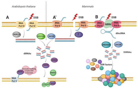 Biogenesis of double-strand break-induced RNA (diRNA) and DNA damage response small RNA (DDRNA). (A) diRNAs biogenesis in Arabidopsis thaliana and (A’) in human cells. After DSB induction, RNA Pol IV (in plants) and RNA Pol II (in humans) transcribe the DNA in the vicinity of DSB to produce the primary transcripts. RDR2 or RDR6 in plants then uses these ssRNA as a template for dsRNA synthesis. In humans, the molecular factors involved in this step have not yet been characterized. Subsequently, dsRNAs are cleaved by DCL2, DCL3 or DCL4 (in plants) or by DICER (in mammals), to produce a pool of 21–24 nt long small RNAs (diRNAs). Next, diRNAs are incorporated into AGO2 proteins leading to the removal of the passenger strand. The AGO2—diRNA complexes act as a guide for DNA damage response (DDR) factors such as RAD51 or chromatin remodelers to the DSB. (B) The DDRNAs biogenesis in mammals. After DSB induction, primary sensor of DSBs—MRN complex is bound to the site of damaged DNA. Next, the RNA Pol II synthesizes damage-induced long noncoding RNAs (dilncRNAs) from and towards DNA ends. dilncRNAs are then cleaved by DICER and DOSHA, generating DDRNA that participates in DDR signal amplification.