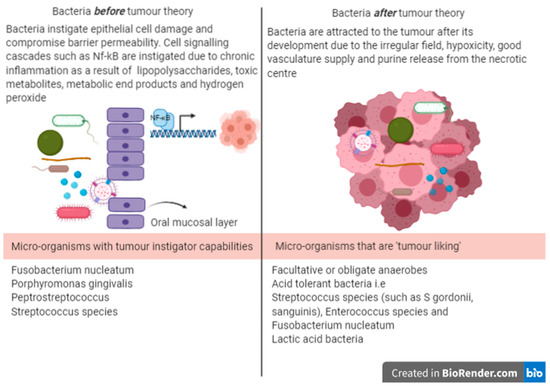 In the bacteria after tumour theory, there are many factors that facilitate the attraction of bacteria to a tumour, including the irregular geographical anatomy and increased vasculature of a cancerous lesion, the hypoxic nature of the tumour environment that particularly favours facultative or obligate anaerobic, saccharolytic and acid-tolerant bacterial genera, the reduced host immunity at the tumour site, the presence of purines in the necrotic centre of the tumour, which can serve as nutrients for bacterial growth and cancer cell chemoattraction, as well as adhesion (through cell membrane glycoconjugates) to bacteria [42]. Some of the commonest Phyla associated with the OSCC environment include Actinobacteria, Bacteroidetes, Firmicutes, Fusobacteria, and Proteobacteria [43].