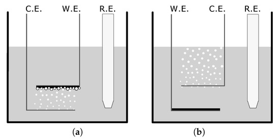 The electrodes were bent from the tip of the electrode, providing a horizontal parallel plate configuration, seen in Figure 1. For flat film creation, the CE was placed above the WE. PPy was deposited on the WE by applying a potential range between 0 and for two cycles. To create microstructures, the WE was placed above the CE. One positive CV cycle between 0 and was applied to deposit a flat PPy base layer on the WE. Any hydrogen bubbles that were on either electrode were removed using nitrogen gas. The potential was cycled in a negative range of to to generate hydrogen bubbles on the WE. After bubble formation, one additional cycle between 0 and was applied. After completion, the films were rinsed and stored in deionized water between creation and doping to prevent drying.
