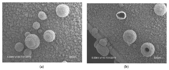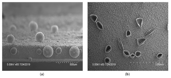 The microstructures created on vertical electrodes included both open and closed spheres, seen in Figure 2 and Figure 3. As shown in Figure 2, the increased number of cycles allowed a longer polymerization time and had an increased number of closed spheres. A total of 7 cycles was used to fully close the sphere and a minimum of 2 cycles was needed to create open features of sufficient thickness to withstand rinsing. An intermediate number of cycles between 2 and 7 yielded increasingly closed structures. It was shown that applying a larger potential range () during electropolymerization resulted in varying types of microstructures to form (Figure 3). Qu et al. recorded a taller structure being created with the increased potential voltage [16]. However, in our work a larger potential range was found to not drastically increase the height of the structures created using these parameters, but resulted in an increased variability in the structures created, seen in Figure 3b, having both open and closed structures on a single film. As a result, the potential range of 0 to was used in subsequent tests for consistency. The closing of microstructures has potential application in drug delivery devices due to the increased storage volume, which warrants further testing in future studies. These results show that there is a large degree of variability in the creation of microstructures. To reduce the variability and increase the density of such microstructures, a horizontal electrode method was adopted using similar CV parameters tested previously.