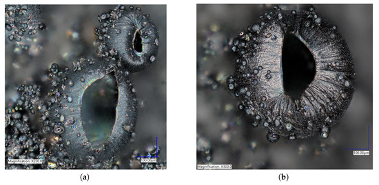 The morphology of the microstructures was studied using a Keyence VHX-7000 optical microscope and a Hitachi S-3400N V scanning electronic microscope. Before imaging, samples were rinsed with 70% ethanol and subsequently dried in order to preserve the structure of surface features. For feature measurements, the VHX-7000 software was used with a three-point edge detection method selection. The computerized edge detection reduced the human error in the measurements of feature diameter. Four separate locations were examined across the film, totaling .