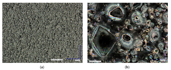 Surface morphology of (a) flat polypyrrole (PPy) films compared to (b) microstructured PPy films at 500X magnification showing the effectiveness of the horizontal plate method for the creation of round microstructures. Image (b) is an example of what was used for the feature size counting outlined in Figure 6.