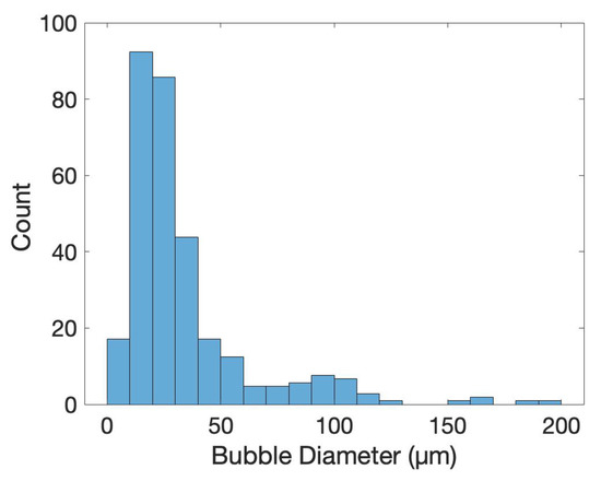 To characterize the difference between flat and microstructured films, the surface of each was imaged using identical microscope settings, seen in Figure 5. The microstructured films showed a large number of bubbles of various sizes, the histogram in Figure 6 shows the distribution of bubble diameter on the surface of the film for . A total of 322 bubbles were measured with an average diameter of . The larger bubbles were between 50 to with smaller bubbles between 10 to attached to the surface of the larger bubbles. The coalescence of bubbles on the WE was difficult to control and resulted in a large variance in bubble size. Nevertheless, the films presented above showed a increased density and smaller diameter compared to previous creation methods, showing the success of the novel horizontal plate setup.