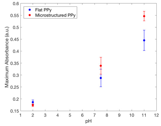 The loading of a model drug FL into the film is based on the ion-doping process, similar to the electropolymerization of Py. For initiating the doping, a positive potential was applied to the electrochemical cell, resulting in the oxidation of the PPy film allowing a positively charged polymer to bind with a negatively charged FL from the FL/NaCl electrolyte solution. It is important to note that cationic drug incorporation into polymer matrix mainly relies on the interactions with a primary anionic dopant [20], not studied in this paper. The results from the doping and pH release tests show that FL was released in both the and 11 pH solutions at room temperature after two hours (Figure 7). At pH , both flat and microstructured films had similarly low release values, whereas at pH 11 the largest amount of FL was released. These results show a clear switching method for drug release using pH and follow the results previously described by Samanta et al. with FL favouring larger release at higher pH values [10]. For use in chronic wounds, the drop in pH from physiological skin of to , seen in chronic wounds, would act as a stimulus for drug release from PPy [1]. The mechanism of drug release is based on the protonation/deprotonation reaction of the PPy backbone in low and high pH, respectively [10]. Deprotonation of the polymer decreases the positive charge and drug anions, such as FL, can be released. On the other hand, protonation increases the overall positive charge of PPy causing FL to become entrapped on the polymer backbone during the oxidation reduction that is created while doping. Incorporation of positively charged compounds is based on the hydrophobic and electrostatic interactions with primary anion dopant [3].