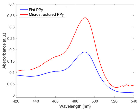 FL was released from both types of films in the neutral and basic pH mediums they were placed in. A higher absorbance peak of FL was recorded by UV spectrometry in a solution where microstructured PPy films were stored, seen in Figure 7. This finding indicates that a larger amount of FL was incorporated and released by the PPy films with microstructures. Using the Beer–Lambert equation it was seen at pH 11 the microstructured films had released compared to for flat films, showing that there was a significant difference between the two structure types for drug delivery at pH 11. To confirm clinical use, the pH value of 8 was used as a severe case wound pH. The average absorbance was plotted against wavelength, seen in Figure 8. A doubling of maximum absorbance can be seen between the microstructured and flat films, taking this data and using the Beer–Lambert equation and normalizing it by area it was found that there was release from microstructured films compared to for flat films. Samanta et al. described only a 13% and 15% FL release from PPy nanoparticles in pH 7.4 and 8, respectively, showing that there could be an increased amount of FL stored in our films unable to be released due to the reduced pH. This also correlates to the higher FL release at pH 11 data presented earlier, a pH not studied by Samanta et al., showing the need for a larger pH for increased % release from PPy [10]. Although the pH 8 flat and microstructure release values are within one standard deviation, there was a 34% average increase of release at pH 8, showing that there was a definitive increase in release despite a large variance in data. This is low compared to the results found by Luo et al. who described a 10X increase in FL release from nanoporous PPy films but this was using electrical stimulation, not seen naturally inside the human body, and therefore not directly applicable with this passive system [7]. The multistep doping and release process used in this study has not been optimized for such small changes in concentrations and future studies will work to reduce the variability, allowing the detection of smaller changes at lower pH values. The outlined results show that hierarchical microstructures allowed increased loading and release capabilities at high pH values. The increased capacity means that the highly porous designs have the potential to deliver medications at a clinically relevant dosages depending on the severity of the wound.