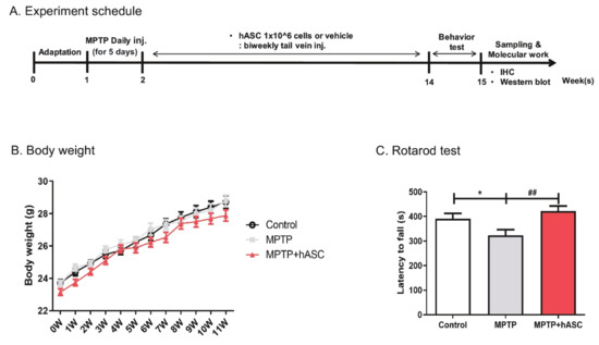 Effects of human adipose-derived stem cells (hASC) transplantation on motor function in 1-methyl-4-phenyl-1,2,3,6-tetrahydropyridine (MPTP)-induced Parkinson’s disease mice. (A) Experimental schemes: MPTP was injected into the abdominal cavity of mice at a concentration of 30 mg/kg for 5 consecutive days. One week after MPTP injection, hASCs (1 × 106 cells/100 μL) were administered into the tail vein 6 times at 2-week intervals. Behavioral tests were performed 2 weeks after the last hASC transplant, and the mice were sacrificed for brain tissue sampling. (B) The weight of the mice was measured weekly during hASC transplantation, which did not differ between groups. (C) The latency time in the rotarod performance test was decreased in MPTP mice compared to that in control mice and significantly increased in the MPTP + hASC mice. All data are indicated as mean ± standard error (n = 9 mice per group). * p < 0.05 vs. Control and ## p < 0.01 vs. MPTP using one-way analysis of variance (ANOVA) and Bonferroni’s post hoc multiple comparisons test.