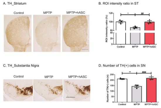 After the motor function test, we performed immunohistochemical analysis using the tyrosine hydroxylase (TH) antibody to examine the recovery of dopaminergic neurons in the ST (Figure 2A) and SN (Figure 2C). In the ST, TH intensity significantly reduced in MPTP-treated mice compared to that in control mice but recovered in MPTP + hASC mice (control, 100.00 ± 2.924; MPTP, 86.78 ± 1.364; p < 0.05 vs. control; MPTP + hASC, 99.75 ± 2.213, p < 0.01 vs. MPTP; p = 0.0006) (Figure 2B). In the SN, the number of TH-positive cells was determined. There were significantly fewer TH-positive cells observed in the MPTP group than in the control group, but they were highly recovered in the MPTP + hASC group (control, 211.3 ± 12.54; MPTP, 144.3 ± 10.13; p < 0.01 vs. control; MPTP + hASC, 217.9 ± 13.64; p < 0.001 vs. MPTP; p = 0.0006) (Figure 2D). Furthermore, the number of TH-positive cells was measured in the ventral tegmental area (VTA) region. Consequently, there was no difference between groups (Figure S2C).