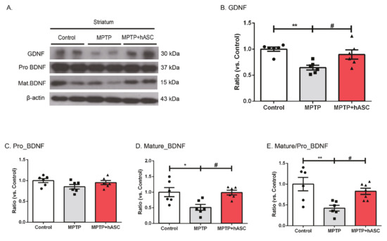 Effects of hASC transplantation on brain-derived neurotrophic factor (BDNF) and glial cell-derived neurotrophic (GDNF) expression in the striatum of MPTP-induced Parkinson’s disease mice. Western blotting analysis was performed using brain tissues of the striatum and substantia nigra regions in each group using anti-BDNF or GDNF antibodies. (A) Representative Western blots of TH in the striatum tissue lysates of each group using BDNF, GDNF, and GAPDH antibodies (n = 6 per group). (B–E) The graph was expressed as the ratio of GDNF (B), pro-BNDF (C), mature BDNF (D), and mature/pro-BDNF, and (E) normalized using β-actin internal control. All data are indicated as mean ± standard error (n = 6 per group). * p < 0.05 and ** p < 0.01 vs. Control, and # p < 0.05 vs. MPTP using one-way ANOVA test and Bonferroni’s multiple comparisons test.