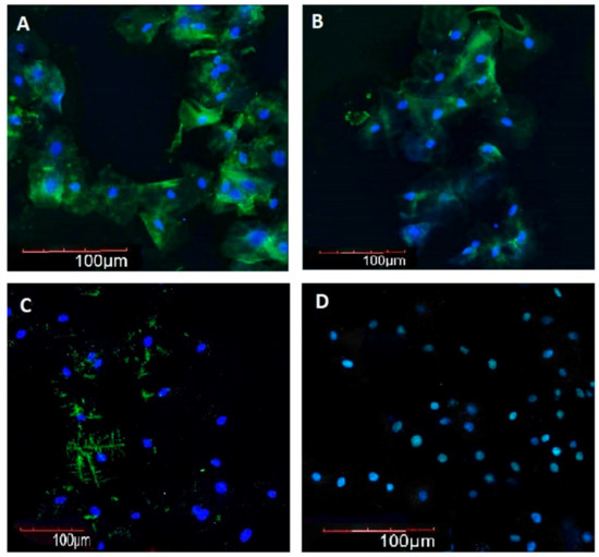 Immunofluorescence intensity of melatonin in buccal epithelium. 200×. Immunofluorescence staining with antibodies to melatonin (Alexa Fluor 488—green fluorescence). Nuclei were counterstained with Hoechst 33258—blue fluorescence. (A) Woman, 28 years old, control, (B) woman, 39 years old, arterial hypertension, (C) woman, 68 years old, control, (D) woman, 67 years old, arterial hypertension.