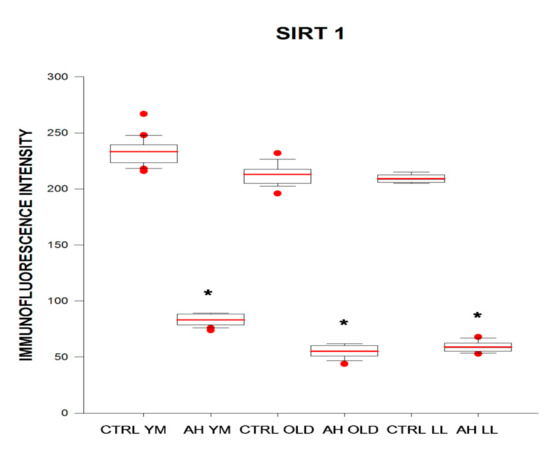Considering the control groups, SIRT6 immunofluorescence intensity in BE was 1.4 and 1.6 times lower in elderly and long-lived controls when compared with young/middle-aged controls, respectively. Comparing control and AH groups, SIRT6 immunofluorescence intensity in BE was 1.89, 3.32, and 2.89 times lower in young/middle-aged, elderly, and long-lived AH patients as compared with age-matched controls, respectively. Considering the AH patients, SIRT6 immunofluorescence intensity in BE was 2.5 and 2.6 times lower in elderly and long-lived AH patients as compared with young/middle-aged AH patients, respectively (Figure 7 and Figure 8). Correlation and regression analyses showed that SIRT6 immunofluorescence intensity in BE in young/middle-aged AH patients was positively correlated with systolic blood pressure values (R = 0.585, p = 0.005), and the variable weight appeared to account for the ability to predict it (p < 0.05).