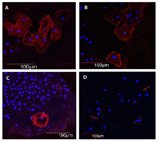 BE was collected from three zones of the oral mucosa with the cytobrush cytological technique. To carry out liquid cytology, the cytobrush was rotated 360° in a clockwise direction five times in the same direction while maintaining gentle pressure and placed in a vial. Cell smears were prepared by the liquid-based cytology technique using the Novoprep automated system (NRS, France) [30]. In each subject, the cell smears were checked by cell count to assess quality and included in the analysis if they contained at least a median of 0.1 × 106 BE cells (range 0.01 × 106 to 0.2 × 106 cells) per cytobrush. The selected samples were examined using RT-PCR as well as immunofluorescence analysis by confocal microscopy.