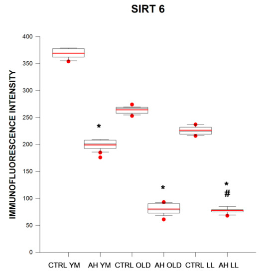 Immunofluorescence intensity (arbitrary units) of SIRT6 in buccal epithelium in healthy subjects (CTRL) and in patients with arterial hypertension (AH) of different ages (young–middle-aged YM, elderly OLD, and long-lived LL). * p < 0.05 as compared with the respective age-matched controls for patients with AH, # p < 0.05 as compared with the other age groups for controls and patients with AH. Box and whiskers show minimum, Q1, median (black line), mean (red line), Q3, maximum, outliers (circle).