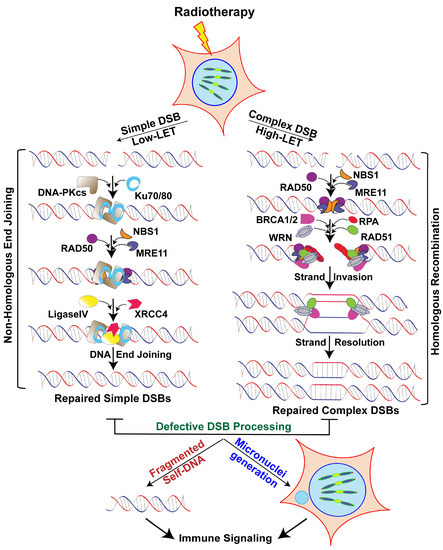 Schematics of the double-strand break (DSB) repair pathways after low- and high-linear energy transfer (LET) radiation. Low-LET radiation induces simple DSBs, which are repaired by non-homologous end joining pathway (NHEJ). The NHEJ process is initiated by the binding of a protein complex, the Ku70/80 heterodimer, to both ends of the broken DNA molecule, which, together with the catalytic subunit of the DNA-dependent protein kinase (DNA-PKcs), generates the DNA-PK complex. Non-ligatable DNA termini are processed by the MRN complex (Mre11/Rad50/Nbs1), and the DNA ends are later rejoined by ligase IV and XRCC4. High-LET radiation causes clustered DNA lesions (or multiply damaged sites). Clustered DNA damage is mostly repaired by homologous recombination (HR). HR is initiated by the resection of the DNA ends through the combined action of the MRN complex (MRE11, RAD50, and NBS1) and CtIP to generate single-stranded DNA overhangs. Subsequently, replication protein-A (RPA) binds to the newly created single-strand region before being exchanged with RAD51. The RAD51/ssDNA complex invades the homologous template DNA, creating a temporary triple-DNA structure in which strand exchange occurs, then DNA synthesis proceeds until the second end is captured. In subsequent steps, a Holliday junction is generated to prime DNA synthesis, which is further resolved by specific nucleases.