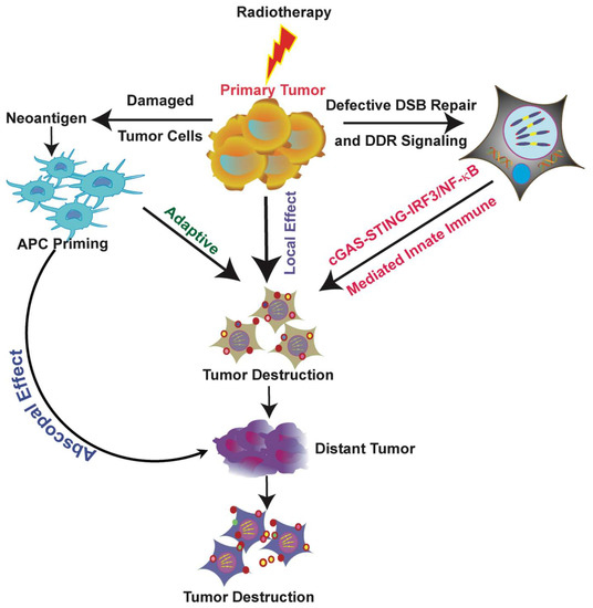Radiation can also modulate immune signaling in the tumor and alter the TME. In doing so, RT can induce antitumor adaptive immunity, which leads to tumor control [93,132,133,134,135]. Innate and adaptive immunity work together to generate a systemic immune response. In cancer, radiation induces DNA damage that activates innate immune responses, and tumor cell death exposes tumor antigens that act as further targets for adaptive immune responses.