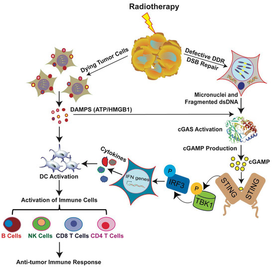 RT can either damage DNA directly or create free radicals that affect DNA indirectly. Innate immune responses to DNA damage induced by radiation are mediated through cytosolic DNA sensors, innate immune receptors that sense double-stranded DNA. Cyclic GMP-AMP synthase (cGAS) is one of the most important DNA sensors that detects cytosolic DNA and triggers the expression of inflammatory genes that activate defense mechanisms. Tumor-derived DNA, such as micronuclei, DNA of dead tumor cells, cytoplasmic fragments, and free telomeric DNA, can activate the cGAS pathway and induce cellular senescence and antitumor immunity [88,114,115,116,117,118,119,120,121]. The progression of the cell cycle through mitosis after RT-induced DNA DSBs leads to the formation of micronuclei, cytoplasmic aggregates of damaged DNA encircled by a defective nuclear envelope. Breakdown of the micronuclear envelope exposes DNA to the cytosol, which activates the cytosolic DNA sensor cGAS and the downstream signaling effector stimulator of interferon genes (STING) pathway, which leads to the production of type I interferons (IFNs) [93,122,123,124,125,126] (Figure 3).