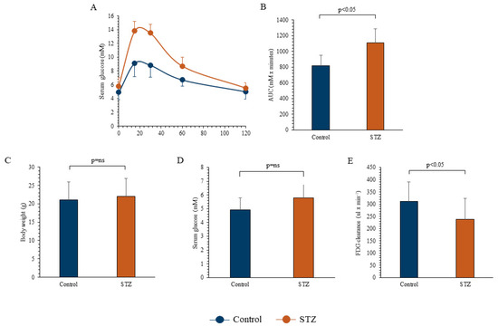 The study protocol included 40 6-week-old male BALB/c mice. A subgroup (n = 23) received a single intraperitoneal administration of Streptozotocin (STZ) at the dose of 150 mg/kg, while the remaining 17 controls received saline. The study was completed in all mice, and no visible side effects occurred after STZ administration. STZ effect was confirmed by an oral glucose tolerance test (OGTT) that was performed two weeks after drug administration and documented a higher area under the curve of serum glucose level with respect to controls (Figure 1A,B). Two weeks thereafter, mice underwent FDG micro-PET imaging. At the time of imaging, mice body weight was similar in both groups (Figure 1C) and fasting serum glucose level was only slightly, though not significantly, higher in STZ with respect to controls (Figure 1D). However, STZ mice showed a significant decrease in blood FDG clearance (Figure 1E).