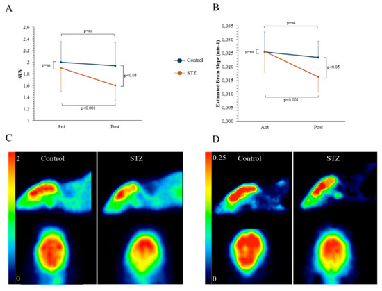 In vivo effects of hyperglycemia on Standardized Uptake Value (SUV) and slope of Patlak. Average SUV (Panel A) and slope of Patlak regression line (k1 × k3)/(k2 + k3) (Panel B) of anterior (Ant) and posterior (Post) brain areas in control (n = 17, blue) and STZ mice (n = 23, brown). Hyperglycemia significantly decreased both parameters in posterior brain regions. Representative images of axial and sagittal projection representing the average SUV (Panel C) and the parametric reconstruction of the Patlak slope (Panel D).