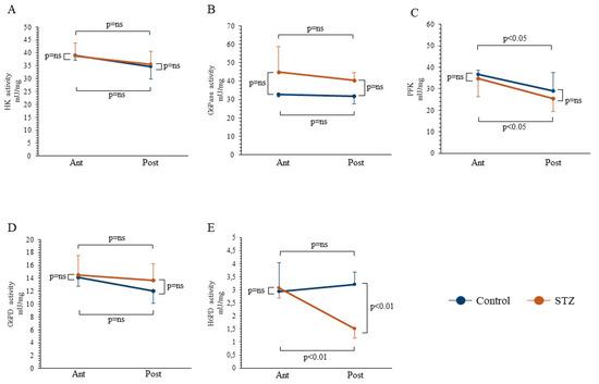 Effect of STZ treatment on enzymatic pathway of glucose degradation. Catalytic activities of hexose-kinase (HK, Panel A), glucose-6-phosphatase (G6Pase, Panel B), Phosphofructokinase (PFK, Panel C), glucose-6-phosphate dehydrogenase (G6PD, Panel D), and hexose-6-phosphate dehydrogenase (H6PD, Panel E) in anterior (Ant) and posterior (Post) brain areas in control (n = 6 for each area, blue) and STZ mice (n = 6 for each area, brown). STZ treatment significantly reduced H6PD catalytic function in posterior brain areas, while it did not affect the main enzymes involved in glucose entrapment, release, and cytosolic catabolism. Data are expressed as mean ± SD.