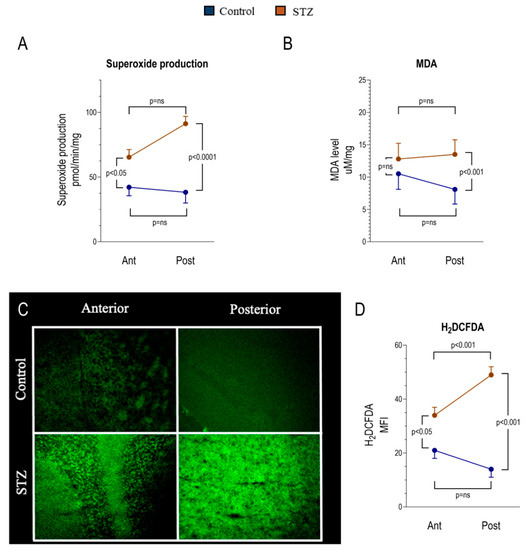 Hyperglycemia effect on oxidative state of anterior and posterior brain areas as assessed by spectrophotometry and cellular fluorescence. Panels A and B show the degree of superoxide production and malondialdehyde (MDA) content in the anterior (Ant) and posterior (Post) brain regions in control (n = 6 for each area, blue) and STZ mice (n = 6 for each area, brown). Panels C and D display representative images of anterior and posterior brain areas stained with 2′,7′-dichlorofluorescein diacetate (H2DCFDA) to assess the presence of Reactive Oxygen Species (ROS) (Panel C) and the corresponding mean fluorescence index (MFI) of H2DCFDA (Panel D) in the same subgroups. Data are expressed as mean ± SD.