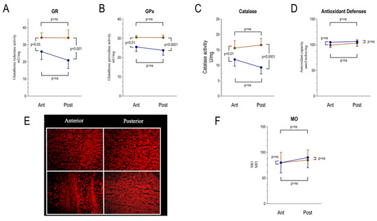 Antioxidant response to the hyperglycemia-related oxidative damage by anterior and posterior brain areas as assessed by spectrophotometry and cellular fluorescence. Panels A–C show the enzymatic activity of glutathione reductase (GR), glutathione peroxidase (GPx), and catalase (CAT) in the anterior (Ant) and posterior (Post) brain regions in control (n = 6 for each area, blue) and STZ mice (n = 6 for each area, brown). Panel D shows the total antioxidant capacity, evaluated as Trolox equivalent in the same subgroups. Panel E displays representative images of anterior and posterior brain areas stained with Mercury Orange (MO) and the corresponding mean fluorescence index (MFI, Panel F) in the same subgroups. Data are expressed as mean ± SD.