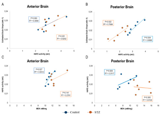 Altogether, observed data thus suggested a selective increase in redox stress in posterior brain regions of STZ-mice that also showed a selective decrease in H6PD catalytic function. These observations suggest a possible role for the decreased ER-PPP activity both in impairing FDG uptake and enhancing the redox imbalance. We tested this hypothesis in the 12 brains that underwent biochemical analyses. In this subgroup, the avidity for the tracer (estimated by the slope of Patlak regression line) directly correlated with H6PD enzymatic activity in both anterior and posterior cortex of both control and STZ mice (Figure 6A,B). On the other hand, the link between H6PD catalytic function and MDA content was directly correlated in all subgroups but the posterior brain of STZ mice, in which the reduced enzyme function was paralleled by an increased MDA content (Figure 6C,D).