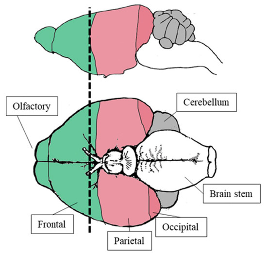 Anterior (green) and posterior (pink) brain cortex partition. As displayed, the brain was cut just in front of the optic chiasm. Consequently, the “anterior segment” mostly included frontal and olfactory cortex, while the posterior one mainly encompassed parietal–temporal and occipital lobes with the possible contamination of a small fraction of the midbrain.