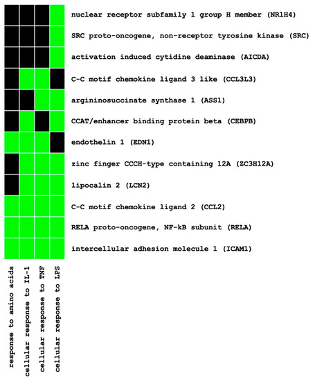 Functional annotation of differentially expressed genes using pathway enrichment analysis (DAVID): gene–pathway relationships of the highest ranked pathway cluster (enrichment score, 3.51). Established (=green) and unknown (=black) gene–pathway relationships.