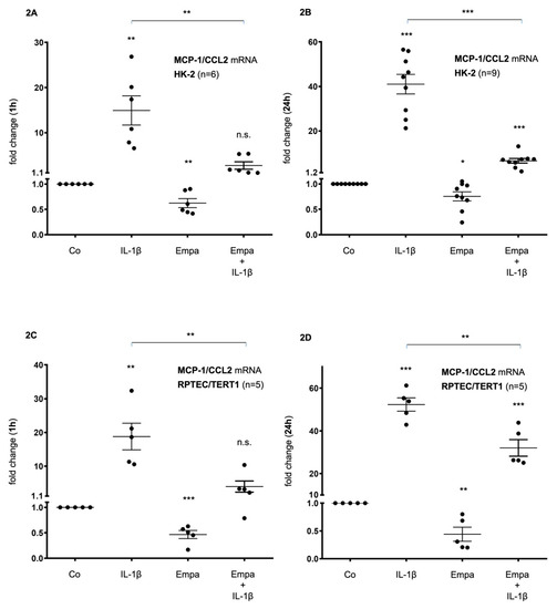 In HK-2 cells, basal MCP-1/CCL2 mRNA expression was upregulated by IL-1β (10 ng/mL) after 1 h (15-fold, p < 0.01) and 24 h (41-fold, p < 0.001) but downregulated by Empa (500 nM) after 1 h (0.6-fold, p < 0.01) and 24 h (0.8-fold, p < 0.05). The co-administration of Empa inhibited IL-1β-mediated MCP-1/CCL2 mRNA expression after 1 h (0.2-fold, p < 0.01) and 24 h (0.16-fold, p < 0.001) (Figure 2A,B). Concordant results were obtained in RPTEC/TERT1 cells: IL-1β (10 ng/mL) led to a 19- and 52-fold induction of basal MCP-1/CCL2 mRNA expression after 1 and 24 h (p < 0.01 and p < 0.001), respectively. Empa inhibited basal MCP-1/CCL-2 mRNA expression 0.5-fold (p < 0.001) and 0.44-fold (p < 0.01) after 1 and 24 h, respectively. The co-administration of Empa inhibited IL-1β-mediated MCP-1/CCL2 mRNA expression by 0.2-fold (p < 0.01) and 0.6-fold (p < 0.01) after 1 and 24 h, respectively (Figure 2C,D).