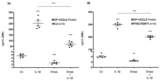 Inhibitory effect of empagliflozin on basal and IL-1β-induced MCP-1/CCL-2 protein expression in human proximal tubular cells. HPTCs were serum- and supplement-starved for 24 h and then stimulated for 24 h with IL-1β (10 ng/mL), 500 nM Empa, or a combination of Empa (500 nM) and IL-1β (10 ng/mL). Controls (Co) were left unstimulated for 24 h (A,B). Cell supernatants from n = 5 independent experiments were used for ELISA. Data are presented as concentrations when compared with MCP-1/CCL2 control levels. For each experimental condition, data of five independent experiments are presented as dots in scatter plot graphs with the respective mean ± SEM bars. (A) In HK-2 cells, IL-1β (10 ng/mL) induced MCP-1/CCL2 protein expression 54-fold (*** p < 0.001 compared with unstimulated control cells). Empa (500 nM) downregulated basal MCP-1/CCL2 protein expression by 0.53-fold (*** p < 0.001, compared with unstimulated control cells). Administration of Empa in the presence of IL-1β resulted in a 0.27-fold inhibition of IL-1β-induced MCP-1/CCL2 protein expression (*** p < 0.001 when compared with IL-1β-stimulated cells). (B) In RPTEC/TERT1 cells, IL-1β (10 ng/mL) induced MCP-1/CCL2 protein expression 73-fold (*** p < 0.001 compared with unstimulated control cells). Empa (500 nM) downregulated basal MCP-1/CCL2 protein expression by 0.6–fold (** p < 0.01, compared with unstimulated control cells). Administration of Empa in the presence of IL-1β led to a 0.67-fold inhibition of IL-1β-induced MCP-1/CCL2 protein expression (*** p < 0.001 when compared with IL-1β-stimulated cells).